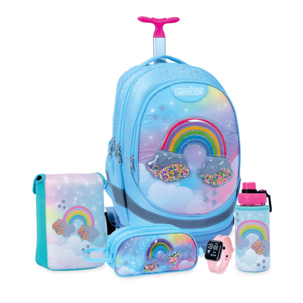 מארז מוצרים מנצח שכל ילד שעולה לכיתה א' ישמח לקבל. כל מוצרי המארז מעוצבים בעיצוב אחיד וארוזים באריזת מתנה מרשימה. מה מכיל המארז המנצח? תיק אורטופדי מודן air flex bag+ כיסוי נגד גשם מתנה עגלת טרולי איכותית קלמר שני תאים ממותג בעיצוב תואם לעיצוב התיק קופסת אוכל בכיסוי תרמי תואם לעיצוב התיק בקבוק שתייה בכיסוי תרמי תואם לעיצוב התיק שעון דיגיטלי מתנה תיק אורטופדי משולב עם עגלת טרולי תיק אורטופדי חדיש משולב עם עגלת נשיאה הניתנת להסרה. מאפשרת לתלמיד לשאת את התיק בשלושה אופנים: 1. גרירה על גבי העגלה ייעודית עם גלגלי סיליקון עמידים 2. נשיאה על הגב כאשר העגלה מחוברת לתיק 3. נשיאה על גבי הגב של התיק האורטופדי לבדו לאחר הסרה פשוטה ומהירה של מערכת העגלה. מערכת Air-flex BAG היא פיתוח ייחודי של חברת מודן והיא משלבת בגב התיק כריות לתמיכה מתקדמת שפותחו במיוחד למטרה זו. מערכת התמיכה, למעשה מפחיתה את רמת העומס על גב הילד הנוצרת כתוצאה ממשקל תכולת התיק ותנועת הילד בהליכה. עגלת הנשיאה עם תחתית שקופה מפלסטיק קשיח, מוט נשיאה טלסקופי מתכוונן המאפשר התאמה לגובה הילד מאלומיניום קל משקל. וגלגלי סיליקון איכותיים. העגלה ניתנת לפירוק. קלמר שני תאים קלמר מחולק לשני תאים עם שני רוכסנים נפרדים וחזית מעוצבת. מיוצר מבדים חזקים ורוכסנים איכותיים וממגוון עיצובים. קופסת אוכל עם כיסוי תרמי קופסת אוכל בעלת 3 תאים ומכסה עם שני מנגנוני נעילה כיסוי תרמי השומר על בידוד הקופסה הפנימית מתאימה להקפאה, חימום במיקרוגל ולשימוש במדיח כלים בטוח לשימוש ללא BPA בקבוק שתייה עם כיסוי תרמי בקבוק לשתייה קרה בנפח 500 מ"ל פקק מתברג עם מנגנון לפתיחה נוחה כיסוי תרמי מבודד ושומר על טמפרטורת התכולה בטוח לשימוש ללא BPA