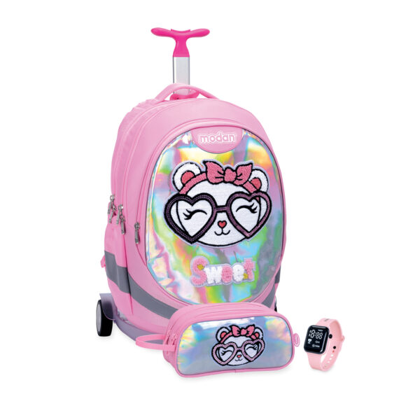 מארז מתנה באריזה מהודרת שכל ילד שעולה לכיתה א' ישמח לקבל. כל מוצרי המארז מעוצבים בעיצוב אחיד וארוזים באריזת מתנה מרשימה. מה מכיל המארז המנצח? תיק אורטופדי מודן air flex bag+ כיסוי נגד גשם מתנה עגלת טרולי איכותית קלמר שני תאים ממותג בעיצוב תואם לתיק שעון דיגיטלי מתנה תיק מודן סמארט טרולי SMART TROLY by modan תיק אורטופדי עם מערכת Air Flex Bag הייחודית שפותחה במודן משולב עם עגלת נשיאה הניתנת להסרה. מאפשרת לתלמיד לשאת את התיק בשלושה אופנים: גרירה על גבי העגלה ייעודית עם גלגלי סיליקון עמידים נשיאה על הגב כאשר העגלה מחוברת לתיק נשיאה של התיק האורטופדי לאחר הסרה פשוטה ומהירה של מערכת העגלה. מערכת Air-flex BAG היא פיתוח ייחודי של חברת מודן והיא משלבת בגב התיק כריות תמיכה מתקדמת בגב הילד, שפותחו במיוחד למטרה זו. מערכת התמיכה, למעשה מפחיתה את רמת העומס על גב הילד הנוצרת כתוצאה ממשקל תכולת התיק ותנועת הילד בהליכה. עגלת הנשיאה מורכבת מתחתית שקופה מפלסטיק קשיח, מוט נשיאה טלסקופי מאלומיניום קל משקל המתכוונן ומאפשר התאמה לגובה הילד וגלגלי סיליקון איכותיים. העגלה ניתנת לפירוק פירוט על התיק: תיק אורטופדי איכותי לבית הספר עם מערכת תמיכה אורטופדית לגב הילד הנותנת תמיכה מלאה לגב הילד בשלושה אזורים חשובים: כתפיים, שכמות וגב תחתון. כתפיות מרופדות תלת שכבתיות העשויות מחומר מאוורר הניתנות להתאמה גם לגובה התיק על גב הילד וגם להתאמת מרחק התיק מהגב. הכתפיות נתפרות בתפירה כפולה המבטיחה את עמידותן בנשיאת התיק תחתית קשיחה המאפשרת את העמדת התיק על הרצפה בצורה יציבה ותורמת לתמיכה תחתונה ולחלוקת משקל טובה. חלוקה ל-3 תאים מרווחים. התא הקדמי עשוי מחומר עם תכונות בידוד טרמי ולכן מתאים לאחסון אוכל. ובנוסף 2 כיסים בצידי התיק לאחסון בקבוקי שתיה. התיק עשוי מבד דוחה מים שמגן מפני חדירת גשם ובנוסף כיסוי נגד גשם מתנה מחזירי אור על גבי התיק לבטיחות התלמיד/ה עפ"י התקן הישראלי. התיק מיוצר מבד איכותי בצפיפות גבוהה (D600) ורוכסנים איכותיים המאפשרים פתיחת וסגירת התאים בקלות.