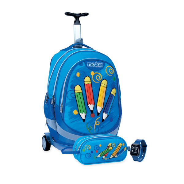 מארז מתנה באריזה מהודרת שכל ילד שעולה לכיתה א' ישמח לקבל. כל מוצרי המארז מעוצבים בעיצוב אחיד וארוזים באריזת מתנה מרשימה. מה מכיל המארז המנצח? תיק אורטופדי מודן air flex bag+ כיסוי נגד גשם מתנה עגלת טרולי איכותית קלמר שני תאים ממותג בעיצוב תואם לתיק שעון דיגיטלי מתנה תיק מודן סמארט טרולי SMART TROLY by modan תיק אורטופדי עם מערכת Air Flex Bag הייחודית שפותחה במודן משולב עם עגלת נשיאה הניתנת להסרה. מאפשרת לתלמיד לשאת את התיק בשלושה אופנים: גרירה על גבי העגלה ייעודית עם גלגלי סיליקון עמידים נשיאה על הגב כאשר העגלה מחוברת לתיק נשיאה של התיק האורטופדי לאחר הסרה פשוטה ומהירה של מערכת העגלה. מערכת Air-flex BAG היא פיתוח ייחודי של חברת מודן והיא משלבת בגב התיק כריות תמיכה מתקדמת בגב הילד, שפותחו במיוחד למטרה זו. מערכת התמיכה, למעשה מפחיתה את רמת העומס על גב הילד הנוצרת כתוצאה ממשקל תכולת התיק ותנועת הילד בהליכה. עגלת הנשיאה מורכבת מתחתית שקופה מפלסטיק קשיח, מוט נשיאה טלסקופי מאלומיניום קל משקל המתכוונן ומאפשר התאמה לגובה הילד וגלגלי סיליקון איכותיים. העגלה ניתנת לפירוק פירוט על התיק: תיק אורטופדי איכותי לבית הספר עם מערכת תמיכה אורטופדית לגב הילד הנותנת תמיכה מלאה לגב הילד בשלושה אזורים חשובים: כתפיים, שכמות וגב תחתון. כתפיות מרופדות תלת שכבתיות העשויות מחומר מאוורר הניתנות להתאמה גם לגובה התיק על גב הילד וגם להתאמת מרחק התיק מהגב. הכתפיות נתפרות בתפירה כפולה המבטיחה את עמידותן בנשיאת התיק תחתית קשיחה המאפשרת את העמדת התיק על הרצפה בצורה יציבה ותורמת לתמיכה תחתונה ולחלוקת משקל טובה. חלוקה ל-3 תאים מרווחים. התא הקדמי עשוי מחומר עם תכונות בידוד טרמי ולכן מתאים לאחסון אוכל. ובנוסף 2 כיסים בצידי התיק לאחסון בקבוקי שתיה. התיק עשוי מבד דוחה מים שמגן מפני חדירת גשם ובנוסף כיסוי נגד גשם מתנה מחזירי אור על גבי התיק לבטיחות התלמיד/ה עפ"י התקן הישראלי. התיק מיוצר מבד איכותי בצפיפות גבוהה (D600) ורוכסנים איכותיים המאפשרים פתיחת וסגירת התאים בקלות.